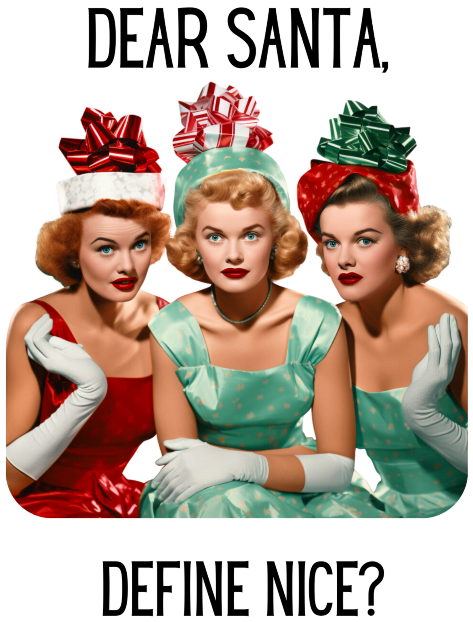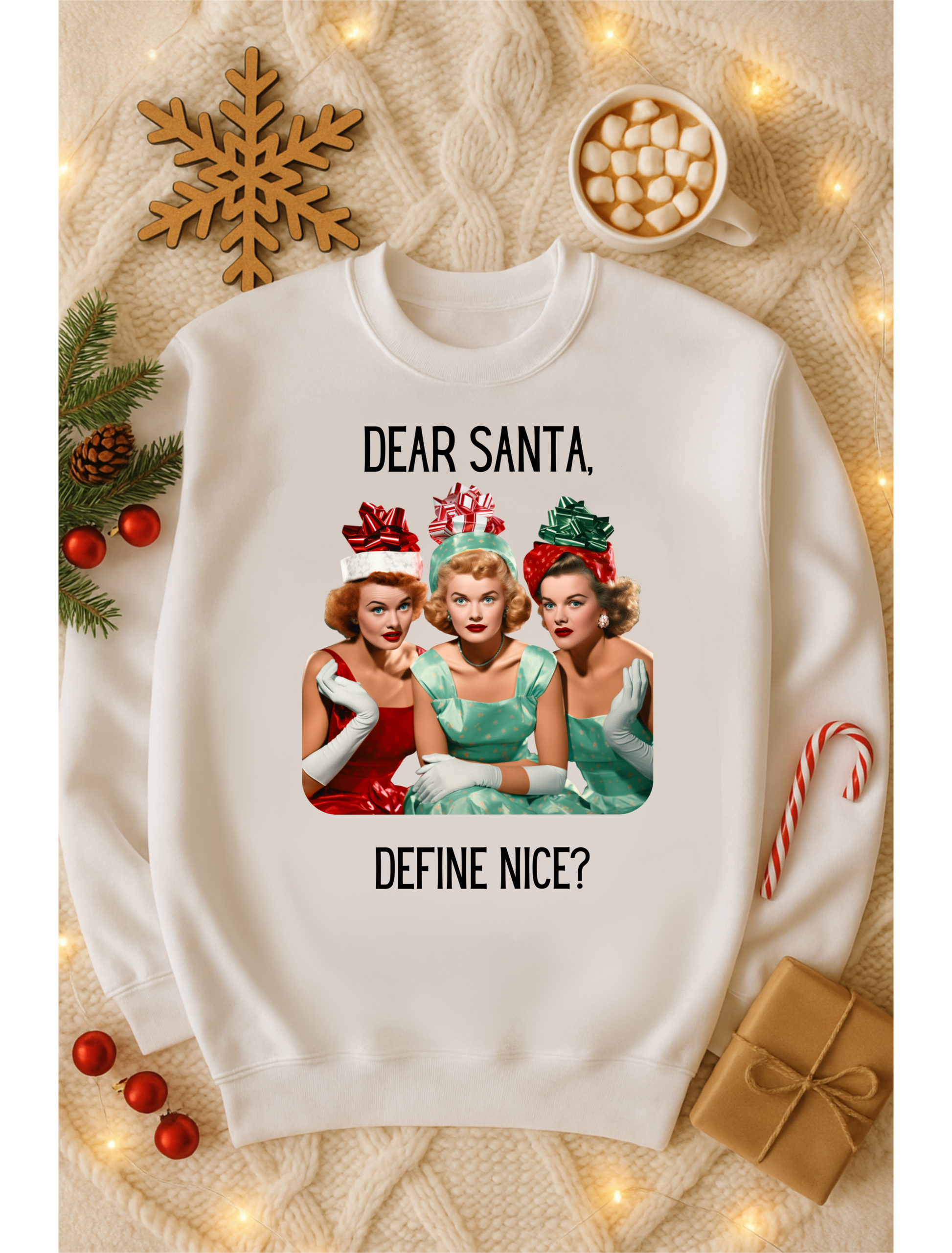 Get cozy this holiday season with our limited-edition 'Dear Santa, Define Nice' sweatshirt! Unisex sizing on a white 50/50 Cotton/ Polyester fleece.