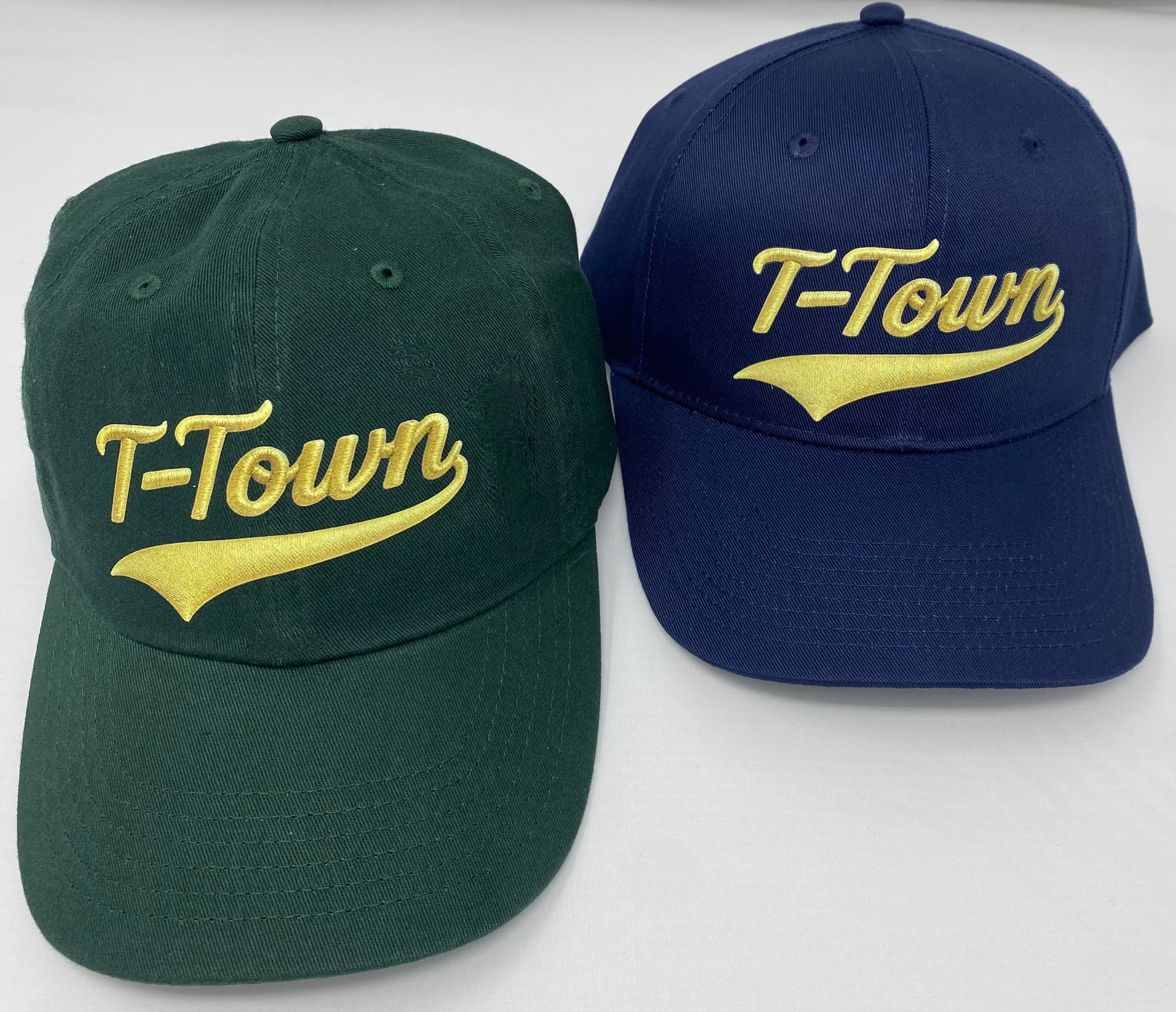 'T - Town' Varsity Style lettering in gold on Dark Green or Navy Blue.